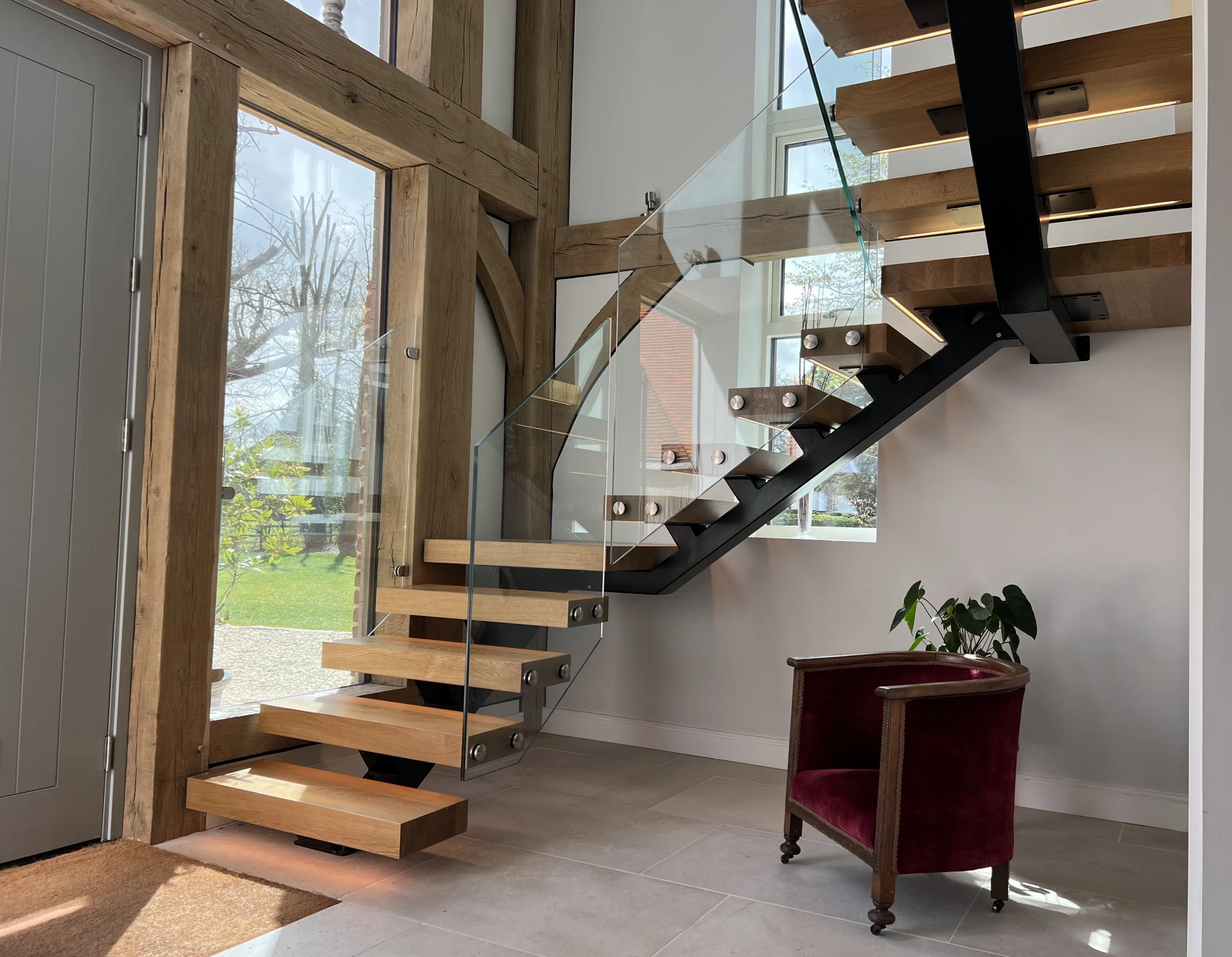 This is the single biggest cost lever. A flat-pack DIY kit replacing an identical timber staircase can come in under £1,000 supplied and £1,500 fitted. A bespoke floating staircase with steel substructure, LED-routed treads and frameless glass balustrade starts at £7,900 and climbs from there. The middle ground — a joiner-built timber staircase with simple spindles — sits at £3,500–£6,500.