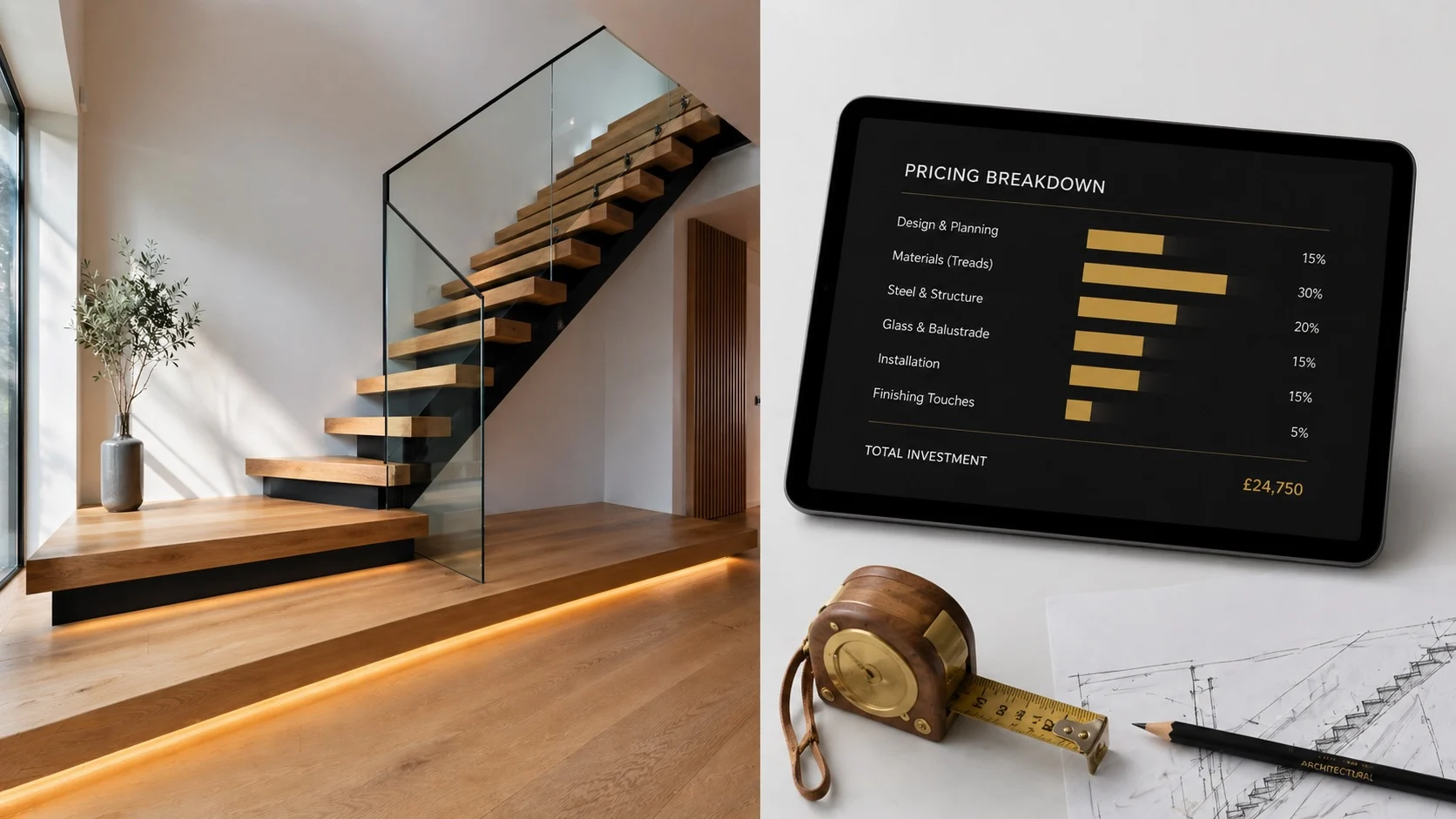 A complete UK staircase quote should itemise every cost — supply, fabrication, removal, install, building control, structural calcs and making good. Lump-sum quotes always hide additions.