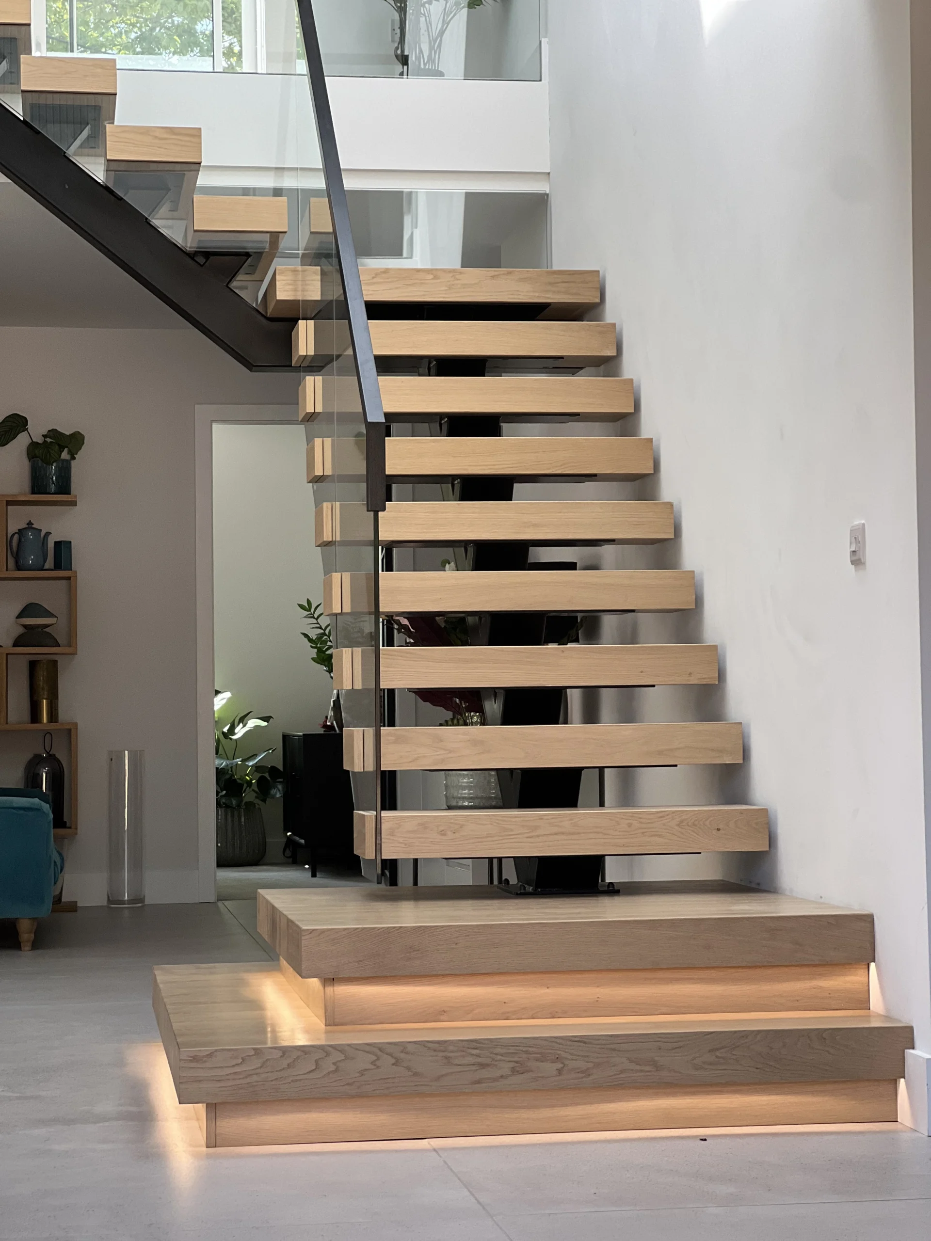 LED-integrated oak treads — step edges clearly defined for safe navigation